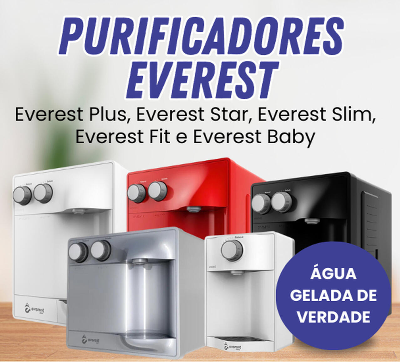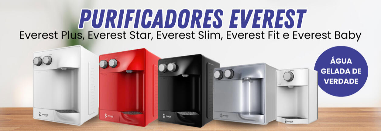 Trabalhamos com cinco modelos: Everest Baby, Everest Slim, Everest Fit, Everest Star e Everest Plus. Cada um atende diferentes necessidades, desde uso residencial até comercial, sempre garantindo água pura e saudável.